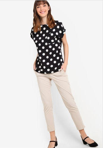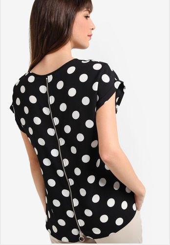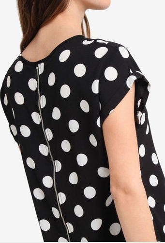 Polka dots made modern with this tee is designed with clean cuts and zip detail for an added edge.